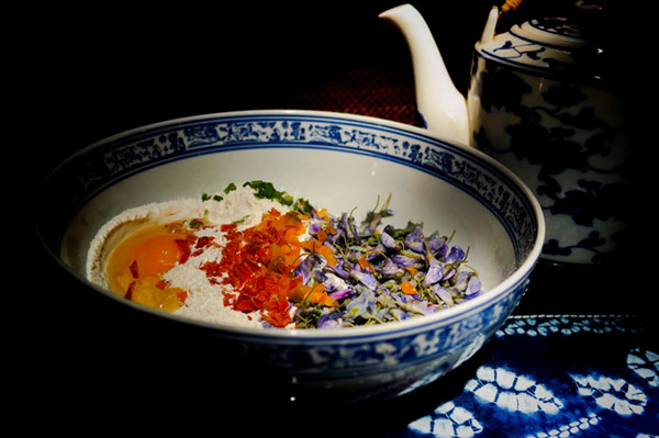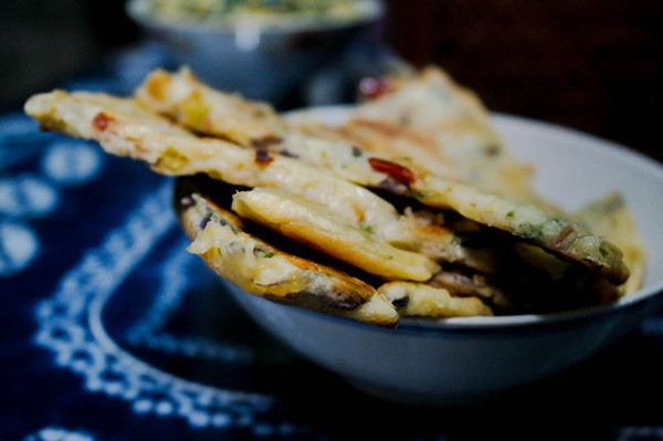 取适量周花揉进面粉里,加添脂油丁、葱花、鸡蛋揉匀擀匀切片,一层层地叠起来,撒上红丝,入鏊煎烤,两面金黄。色彩鲜明的像是平静生活上殷红的一点香艳,亦像是一段有着风露清愁诗意的婉约心绪。