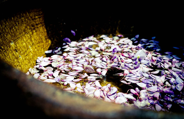 周花花期不长,现摘现做最是新鲜水灵。绩溪人习惯将周花捋下,洗净,加入蜂蜜和白糖腌制一会儿。即便是用水焯过,炒入佐料,依然可见周花淡紫的色泽,赏心悦目。