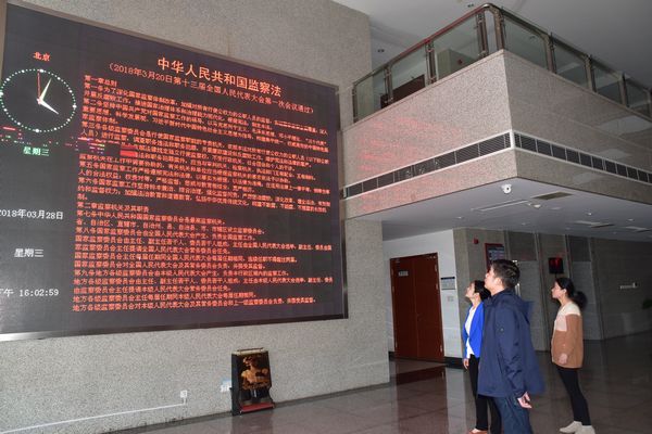 将《宪法修正案》、《监察法》在区政务办公楼显示屏上滚动播放。