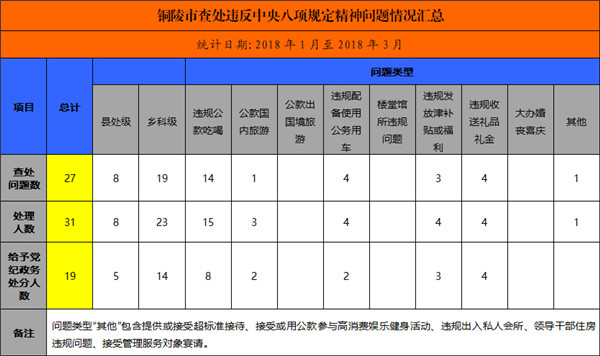 今年以来,铜陵市纪检监察机关把监督检查中央八项规定精神和省、市委《实施细则》贯彻执行情况作为一项常态化重点工作,聚焦元旦、春节等重要节点,紧盯享乐主义和奢靡之风,持续加大监督执纪力度,严肃查处顶风违纪行为。截至3月底,全市共查处违反中央八项规定精神问题27起,处理31人,其中县处级干部8人。从违规问题类型看,节日期间的“四风”问题仍以违规公款吃喝、违规配备使用公务用车和违规收送礼品礼金为主,分别占查处问题总数的51.9%、14.8%、14.8%。具体情况如下: