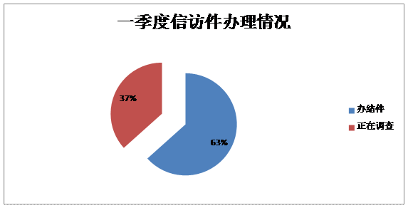 从信访件处置来看,一季度办结信访件38件,办结率63%,正在调查为22件。