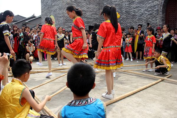 看,小演员们开始了竹竿舞表演。伴随着清脆的敲击声,小朋友们灵巧的身影上下舞动,博得观众们的阵阵掌声。