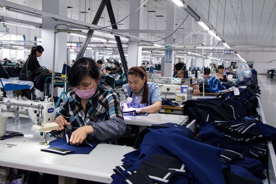 服装厂里,女工们在整齐有序,一丝不苟地加工服饰。