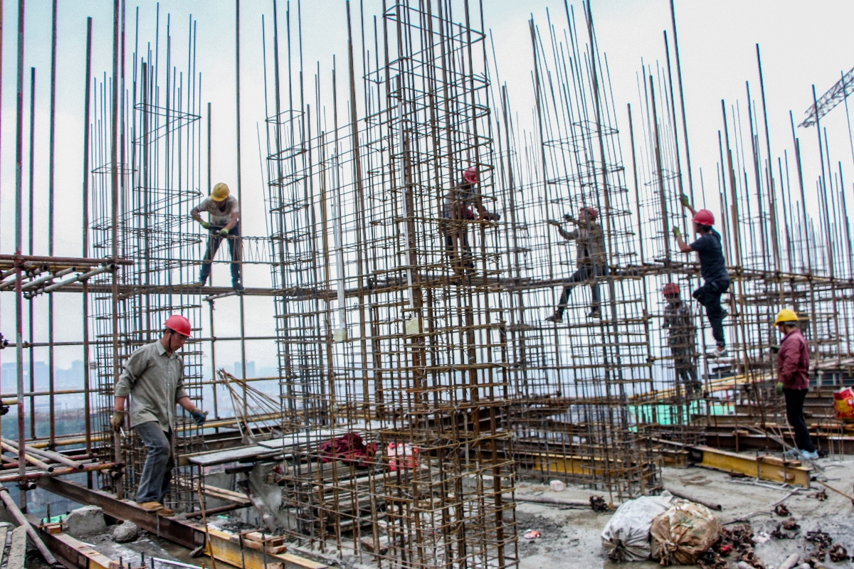 “扎紧钢铁骨架,建起高楼大厦”,在建筑工地现场,工人们正在紧张有序地扎筋施工,筑牢万丈高楼的“钢筋铁骨”。