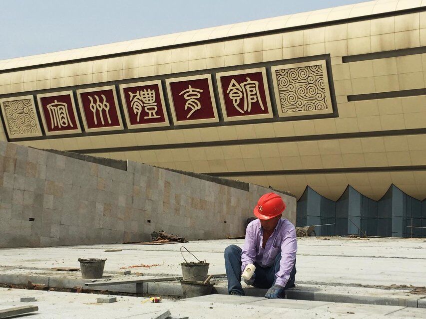 宿州体育馆前,工人在认真细致地铺实路面,保障工程质量。