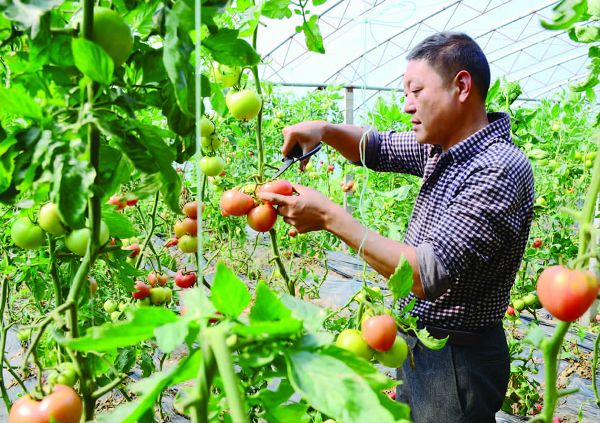 三和集镇大陈村农户在蔬菜大棚内收获西红柿。