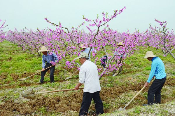 吴圩九梓东大岗的安徽合一生态农业有限公司工人们在万亩桃园内翻整田垄,挖深田墒。