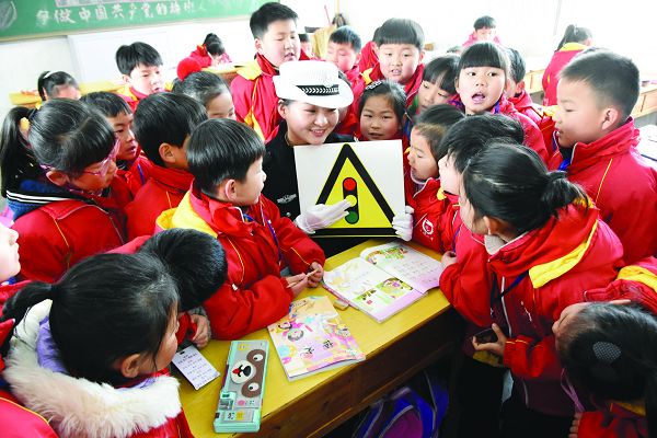 交管大队宣教民警在建设小学向学生讲授交通安全知识。