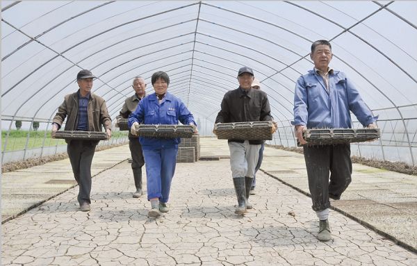 永存粮食种植专业合作社的工人在大棚里搬运水稻秧苗。