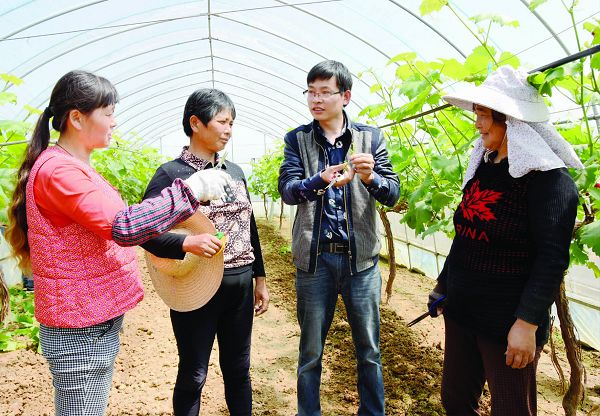严桥乡农技站工作人员在大棚里向农户讲解葡萄剪枝的技术要领。
