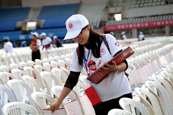 奉献——青年志愿者在宁国市山核桃文化节开幕前认真整理座位、发放宣传卡,用实实在在的行动生动诠释着“我奉献 我快乐”的理念。