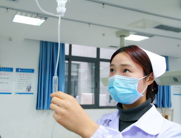 县总医院青年护士细心检查病人的输液情况,调整输液滴数。