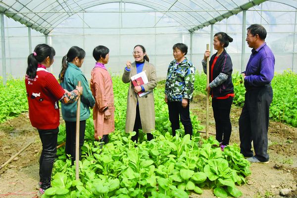 全国人大代表、吴圩镇西孔村党总支第一书记王萌萌在定远县航科生态农业发展有限公司生产基地宣讲“两会”精神。
