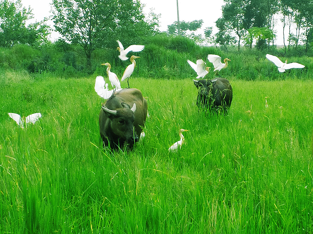 双鹭栖牛背,草长夏木阴。