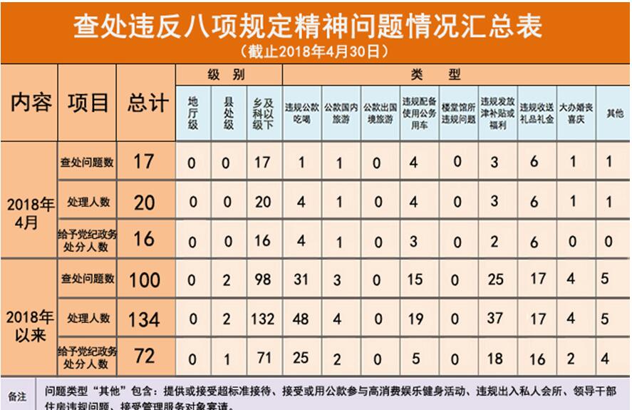 2018年1-4月,滁州市各级纪检监察机关共查处违反中央八项规定精神问题100起,处理134人,给予党纪政务处分72人,其中县处级1人,乡科级及以下71人。