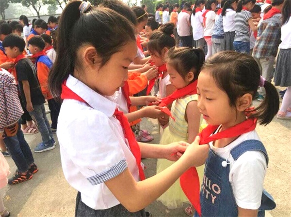 “你好 新时代”,“六一”儿童节,在高年级的队员的帮助下,一批优秀少年儿童佩戴上了鲜艳的红领巾,正式成为少先队的一员。
