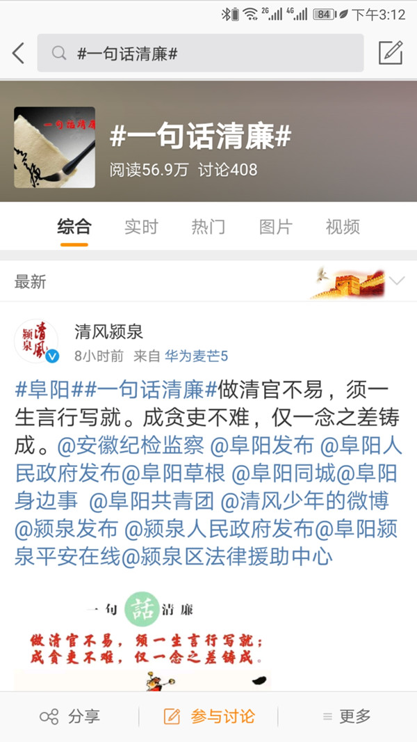 “手莫伸,人生还有很多未经历的美好,‘一句话清廉’的内容清晰易懂、贴近生活,每天我都会将它转发到我个人的朋友圈和单位的工作群,让我镇广大党员干部每天也都感受到廉政熏陶。”宁老庄镇纪委书记章春坤说到。“一句话清廉”不单纯的将廉政文化固化在某一场所和地点,而是让廉政文化插上“翅膀”,让其在“朋友圈”活起来,真实地渗入到党员干部和群众的生活。截止目前,“清风颍泉”微博超话#一句话清廉#共发布图文289张,阅读56.7万次。