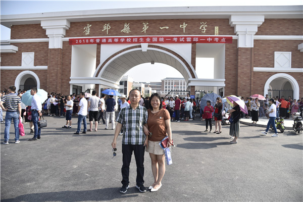 考生家长双双送考,在考点前留影,定格这特殊时刻