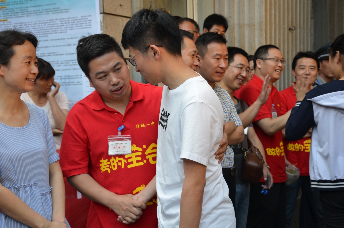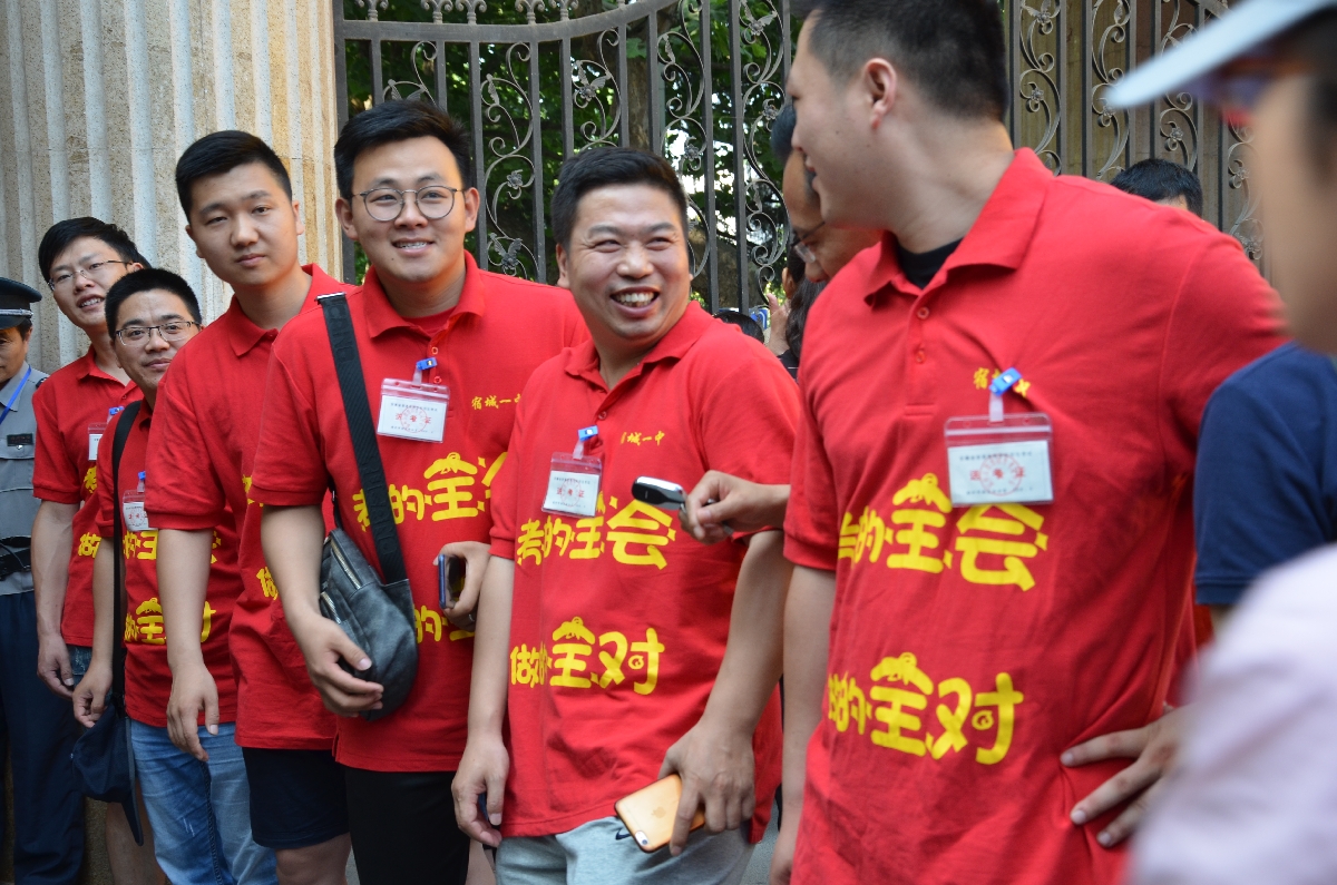 送考老师确认自己的学生们全部都已进入考场,安心地笑了,和其他老师们一起等待自己的学生们高考凯旋!