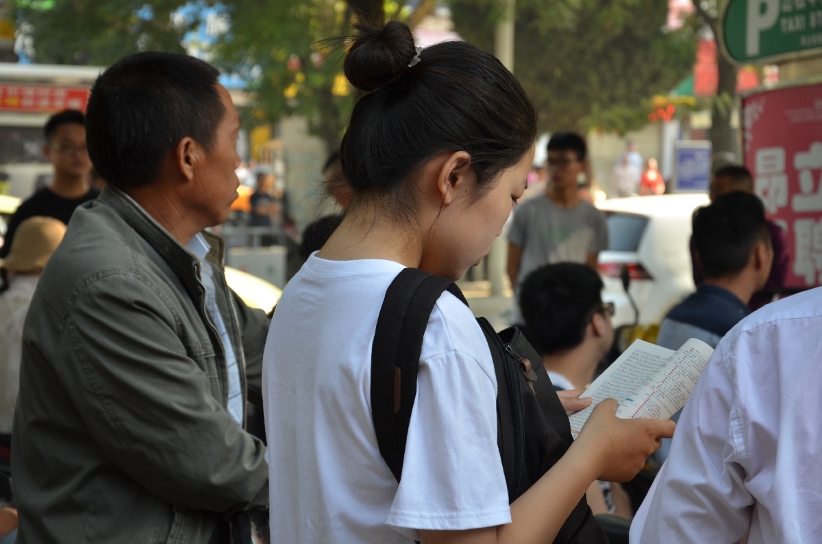 一考生早上7点半就来到了考场门口,还没到进考场时间,小姑娘利用这段时间拿起英语单词工具书背起英语单词,一边进行考前强化记忆,一边也是为了缓解考前紧张的情绪。