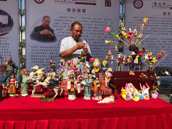商派面塑俗称捏面人,是一种用面粉加彩以后捏塑成各种人物、动物等形态的民间手工艺,形成迄今已有200多年的历史,作品来源广泛、丰富多彩、独具风格。商派面塑具有淮北地方性特色,大多数作品反映的都是淮北民间的风土人情和民俗传说,作品非常适合随身携带和随手把玩,得到了淮北广大人民群众的认可。