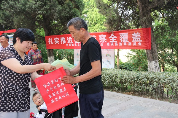 悬挂标语,营造氛围,纪检监察干部走上街头,将印制的党纪国法便民袋发到群众手中。