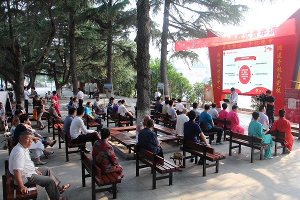 夏日的清晨,红色的标语,新时代传习中心暨开放式党校内座无虚席,认真聆听集中宣讲。