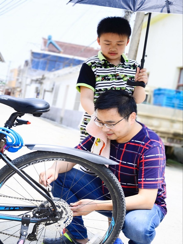 爸爸帮我修车,我为爸爸拭汗水,父子情在点滴中闪光。