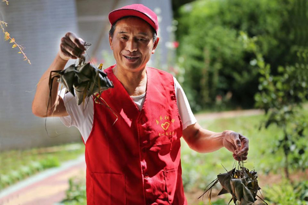 爱心志愿者走进社区,为孤寡老人包粽子送温暖。