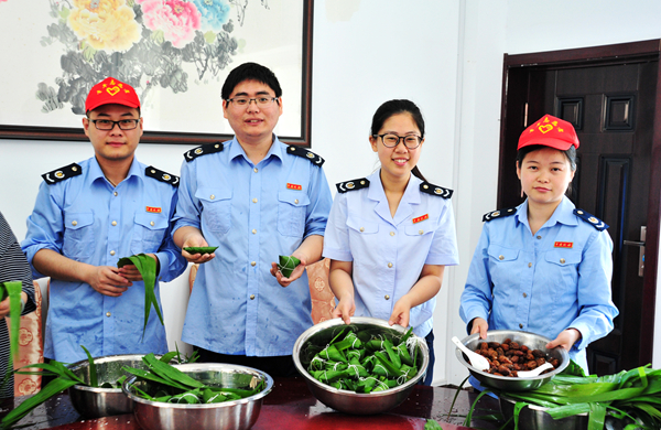 国税部门组织了一场生动的“包粽子大赛”,活动室内一片欢声笑语。
