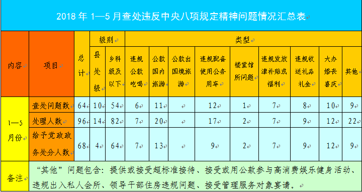 2018年1—5月,阜阳市累计开展明察暗访54次,出动1116人(次),检查单位2701家(次),宾馆酒店等娱乐场所971家(次),风景区78家(次),检查公车数量5153辆(次)。全市共查处违反中央八项规定精神问题64起,处理96人,给予党纪政务处分68人。全市先后发出通报17期,通报问题46起,点名道姓通报曝光75人(次)。
