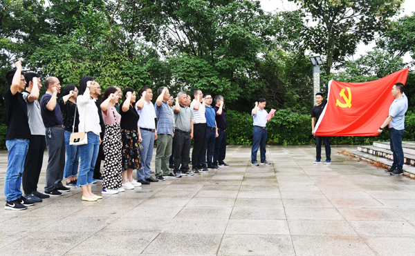 全体党员在讲解员的引导下,首先参观了六霍起义纪念馆,纪念馆再现了独山暴动、六霍起义和苏区春秋的壮丽画卷,展现了无数革命先烈的丰功伟绩,体现了独山革命老区人民,为中国革命和民族解放事业做出巨大贡献、付出极大牺牲的崇高革命精神。随后,大家来到位于独山烈士纪念园的六霍起义纪念塔前,面向党旗重温入党誓词,缅怀革命先烈。