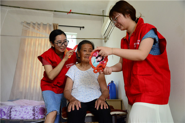 广德县供电公司的党员志愿者,每逢年节都会到敬老院陪伴孤寡老人,为她们梳梳头,陪他们聊聊天,老人们每次都盼着她们的到来。