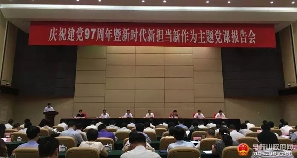 7月4日,马鞍山市委庆祝建党97周年暨新时代新担当新作为主题党课报告会举行。市委书记张岳峰出席会议并作党课报告。他强调,对建党97周年的最好纪念,就是深入学习贯彻习近平新时代中国特色社会主义思想和党的十九大精神,认真贯彻落实习近平总书记关于激励干部新担当新作为的重要指示,扎实推进“讲忠诚、严纪律、立政德”专题警示教育,激励全市广大党员干部新时代新担当新作为,为全面开创新时代马鞍山现代化建设新局面建功立业。