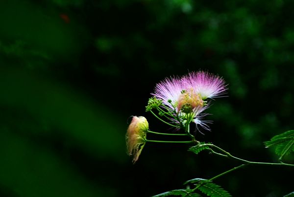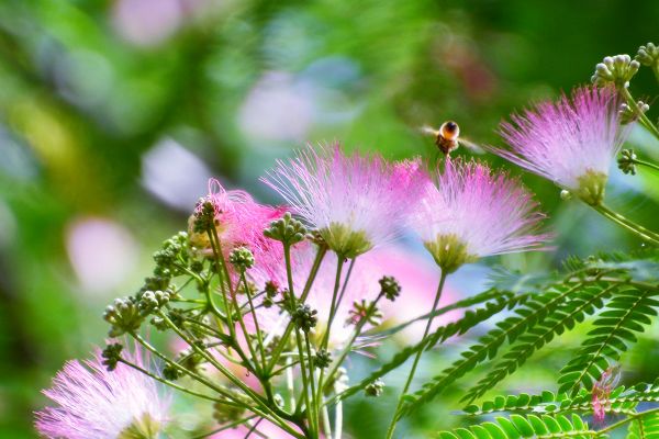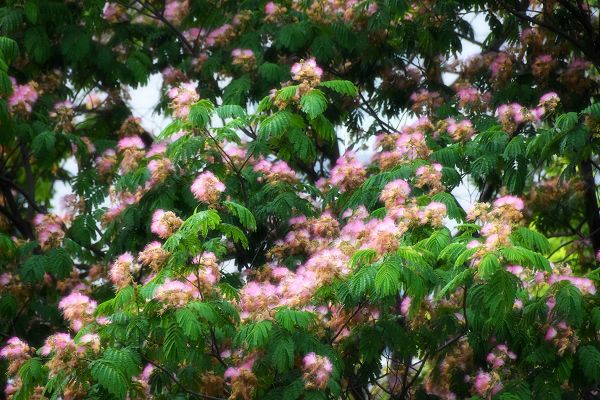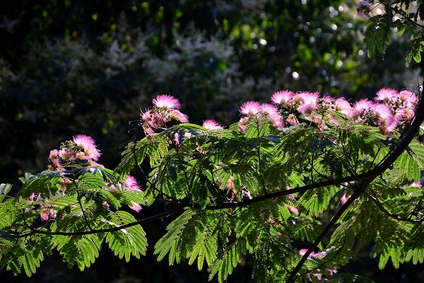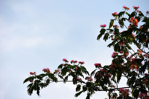 叶似含羞草,花如锦绣团;见之烦恼无,闻之沁心脾。盛夏时节,合欢树绿叶红花,翠碧摇曳。碧绿的枝叶间无数粉红色的小绒花成团成簇,仿佛千万顶粉白相间的小伞,在炎炎烈日下,悠然怒放。如此寂然而有绮丽,自成一景,让人欣然观望。