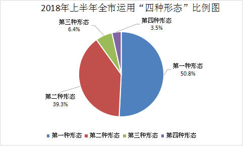 2018年上半年,宿州市纪检监察机关运用监督执纪“四种形态”处理1802人次,同比增长85.2%,其中第一种形态915人次,占比50.8%;第二种形态709人次,占比39.3%;第三种形态115人次,占比6.4%;第四种形态63人次,占比3.5%。