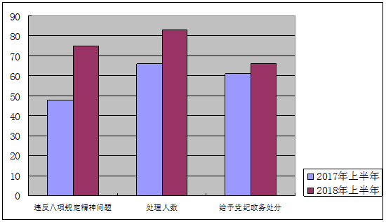 1-6月,淮北市各级纪检监察机关查处违反中央八项规定精神问题75起,同比增长56.3%;处理83人,同比增长25.8%;给予党纪政务处分66人,同比增长8.2%。市纪委监委先后分5批通报19起违反中央八项规定精神问题,公开曝光17起典型问题。