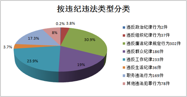 检举控告类信访按涉及违纪、职务违法等行为分:违反政治纪律行为2件,占0.2%;违反组织纪律行为37件,占3.8%;违反廉洁纪律规定行为302件,占30.9%;违反群众纪律186件,占19%;违反工作纪律233件,占23.9%;违反生活纪律36件,占3.7%;职务违法行为169件,占17.3%;其他违法犯罪行为78件,占8%。