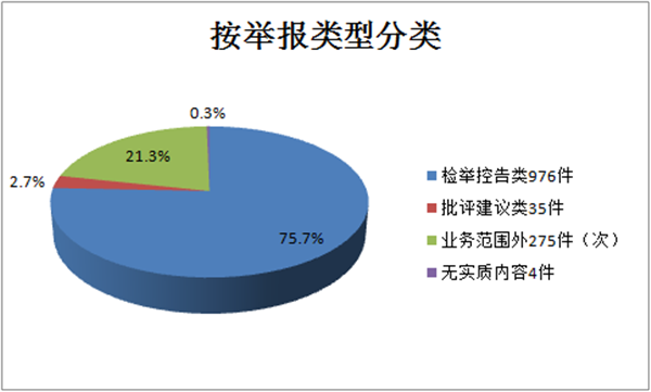 在全市直接受理的信访举报中,检举控告类976件,批评建议类35件,业务范围外275件(次),无实质内容4件,分别占比75.7%、2.7%、21.3%和0.3%。