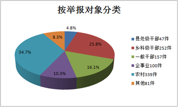 检举控告类信访按涉及人员职级分:县处级干部47件,占4.8%;乡科级干部252件,占25.8%;一般干部157件,占16.1%。其他人员中,企事业100件,占10.3%;农村339件,占34.7%;其他81件,占8.3%。