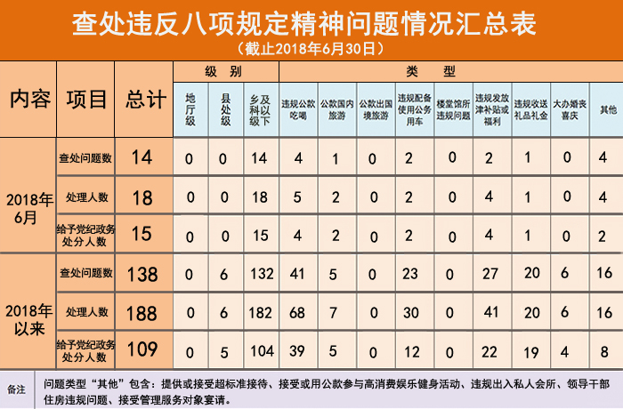 2018年上半年,滁州市各级纪检监察机关共查处违反中央八项规定精神问题138起,处理188人,给予党纪政务处分109人,其中县处级5人,乡科级及以下104人。