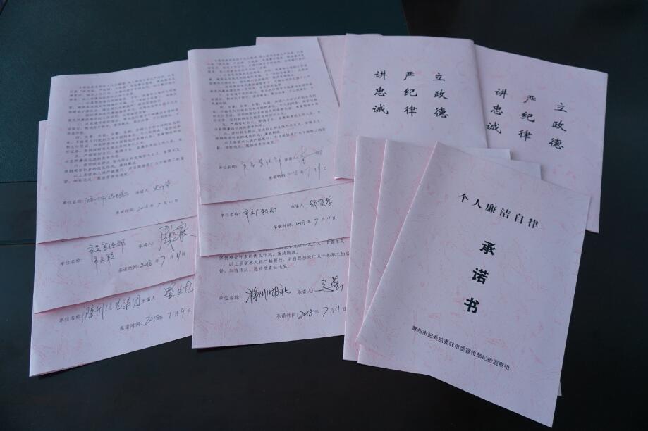 为贯彻落实习近平新时代中国特色社会主义思想和党的十九大精神,深入开展“讲忠诚、严纪律、立政德”专题警示教育,抓住“关键少数”,规范从业行为,严守各项制度。滁州市组织派驻纪检组签订2018年个人廉洁自律承诺书。通过领导班子带头示范,以上率下,层层签订,明确责任,倒逼承诺兑现,从源头上预防和治理腐败。