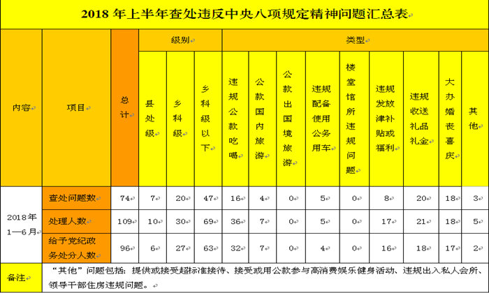 从问题查处的类型看:违规收送礼品礼金20起,大办婚丧喜庆18起、违规公款吃喝16起,分别占问题总数的27%、24.3%、21.6%。违规发放津补贴或福利8起,同比下降50%。违规配备使用公务用车5起,同比下降54.5%。公款国内旅游4起,比去年同期增加3起。其他类问题3起,与去年同期持平。没有发生公款出国境旅游和楼堂馆所违规问题。(蚌埠市纪委监委)