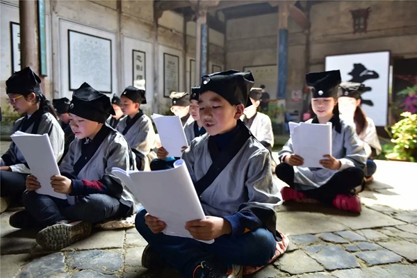 在古老的祠堂内,年幼的孩童身着古装、席地而坐、诵读古文,一字一句的诵读中领略孝道文化、宗谱文化和传统徽文化的魅力,进一步传承和弘扬优秀传统文化。 (组稿:陈园)
