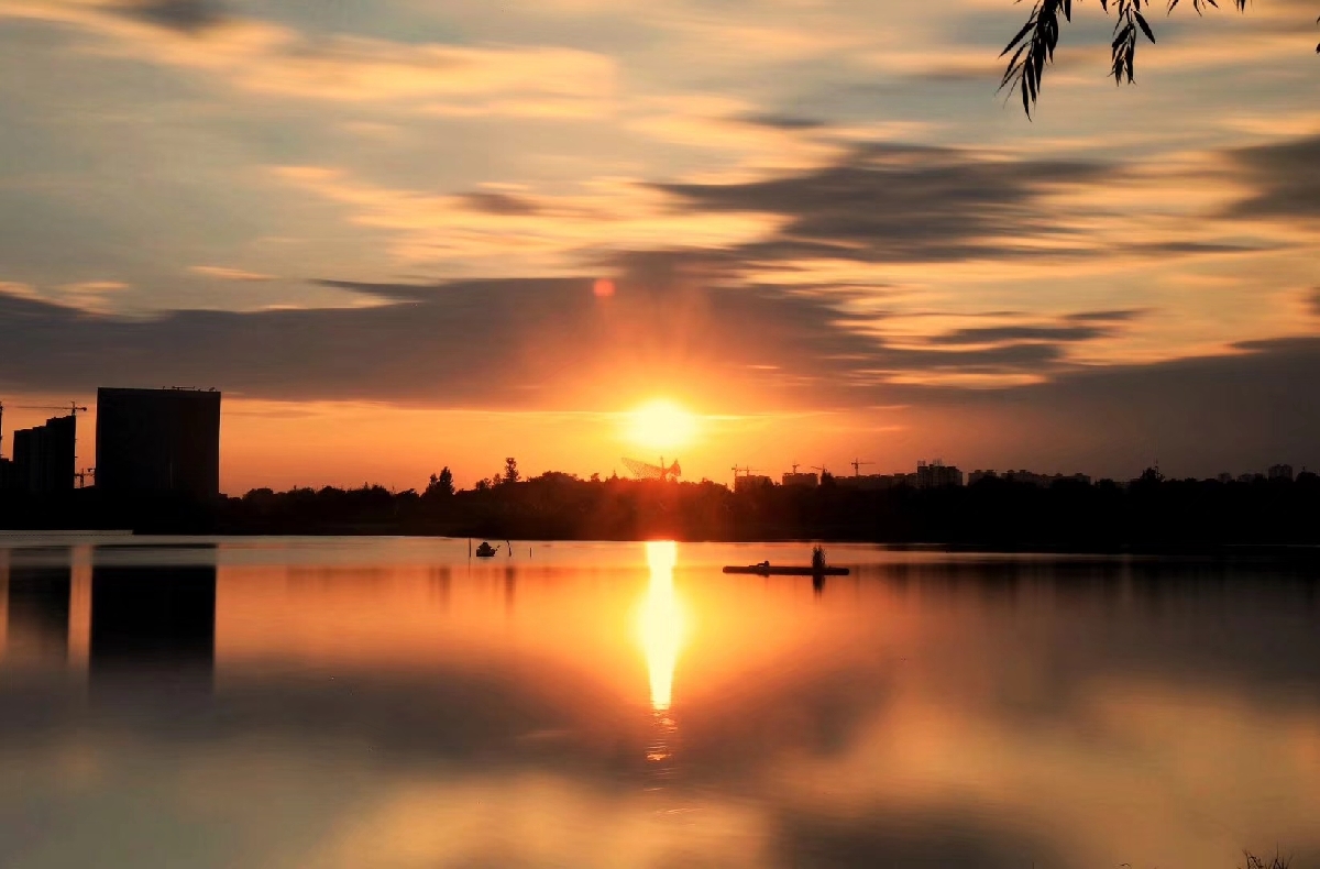 水影虚涵一镜中,晴光摇荡暖云红。