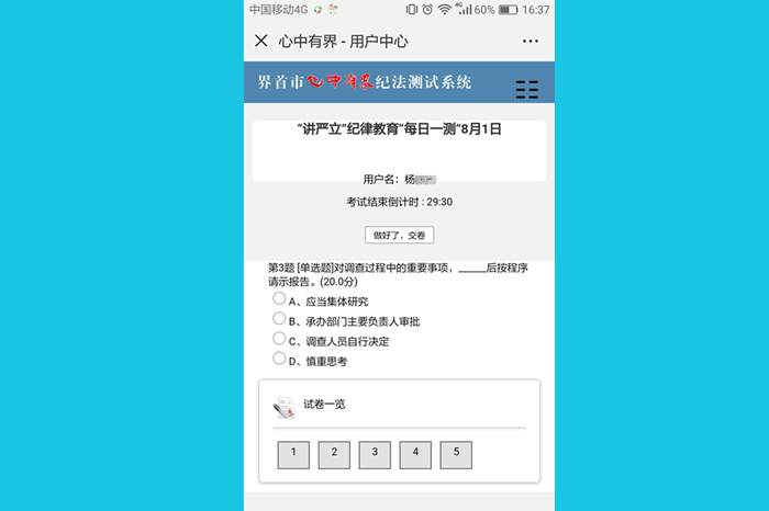 据了解,自“讲忠诚、严纪律、立政德”专题警示教育开始以来,为了经常性开展纪律教育,提升“讲严立”专题警示教育效果,增强全市党员领导干部的纪律和规矩意识。界首市纪委监委创新党章党规党纪和宪法法律法规知识学习方式方法,依托该市开发的“心中有界”纪法在线测试平台,作为该市“讲严立”专题警示教育的“六个一”创新动作之一,组织全市党员干部开展“讲严立”纪律教育“每日一测”活动。该“每日一测”活动每天发布5题测试题,其中单选题3题、多选题1题、判断题1题,共分三批进行,第一批为各部门各单位主要负责同志,第二批测试范围扩大到各部门各单位班子成员,第三批为全市所有党员干部职工。