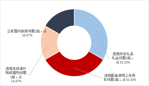 在查处的6起问题中,违规收送礼品礼金问题2起,占33.33%;违规配备使用公务用车问题2起,占33.33%;违规发放津补贴或福利问题1起,占16.67%;公款国内旅游问题1起,占16.67%。1-6月份,共处理7人,其中科级干部5人,占总数的71.43%;科级以下(包括村干部)2人,占总数的28.57%。(宣城市纪委监委)