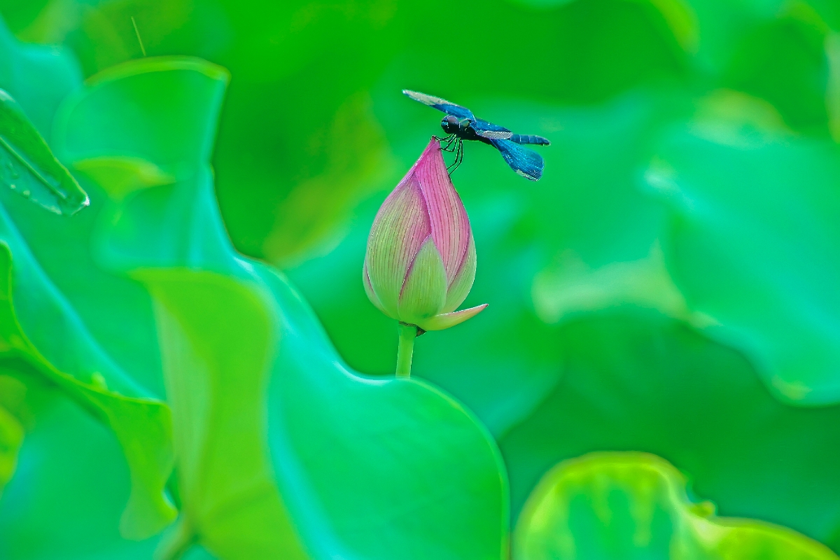 泓泓圆碧漾新绿含玉蜻蜒闲倚蕊