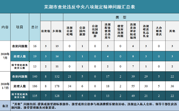 近年来,芜湖市一直坚定不移贯彻落实中央八项规定精神,始终保持整治“四风”顽疾一寸不让高压态势。全市各级纪检监察机关认真履行监督执纪问责职责,2018年1-7月,共查处违反中央八项规定精神问题140起,处理186人,其中给予党纪政务处分135人。