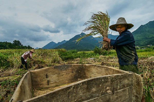 轰鸣机器忙收获,颗粒归仓粮囤圆。